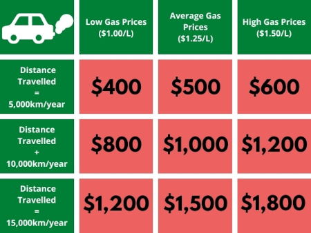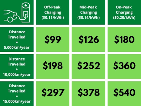 Use the tables below to find approximate yearly fuel costs based on different scenarios. Prices can be found at the intersection of two scenarios. For example, using the EV chart on the left, if you are charging an EV during Off-Peak Hours and you travel 10,000km/year, annual fuel costs will be $198. Or, using the ICEV chart on the right, if average gasoline prices are $1.25, and you travel 10,000km/year, annual fuel costs for an ICEV will be $1,000. Calculations are based on a fuel efficiency of 18kWh/100km for an EV, and 8L/100km for an ICEV, the full formula can be found below.