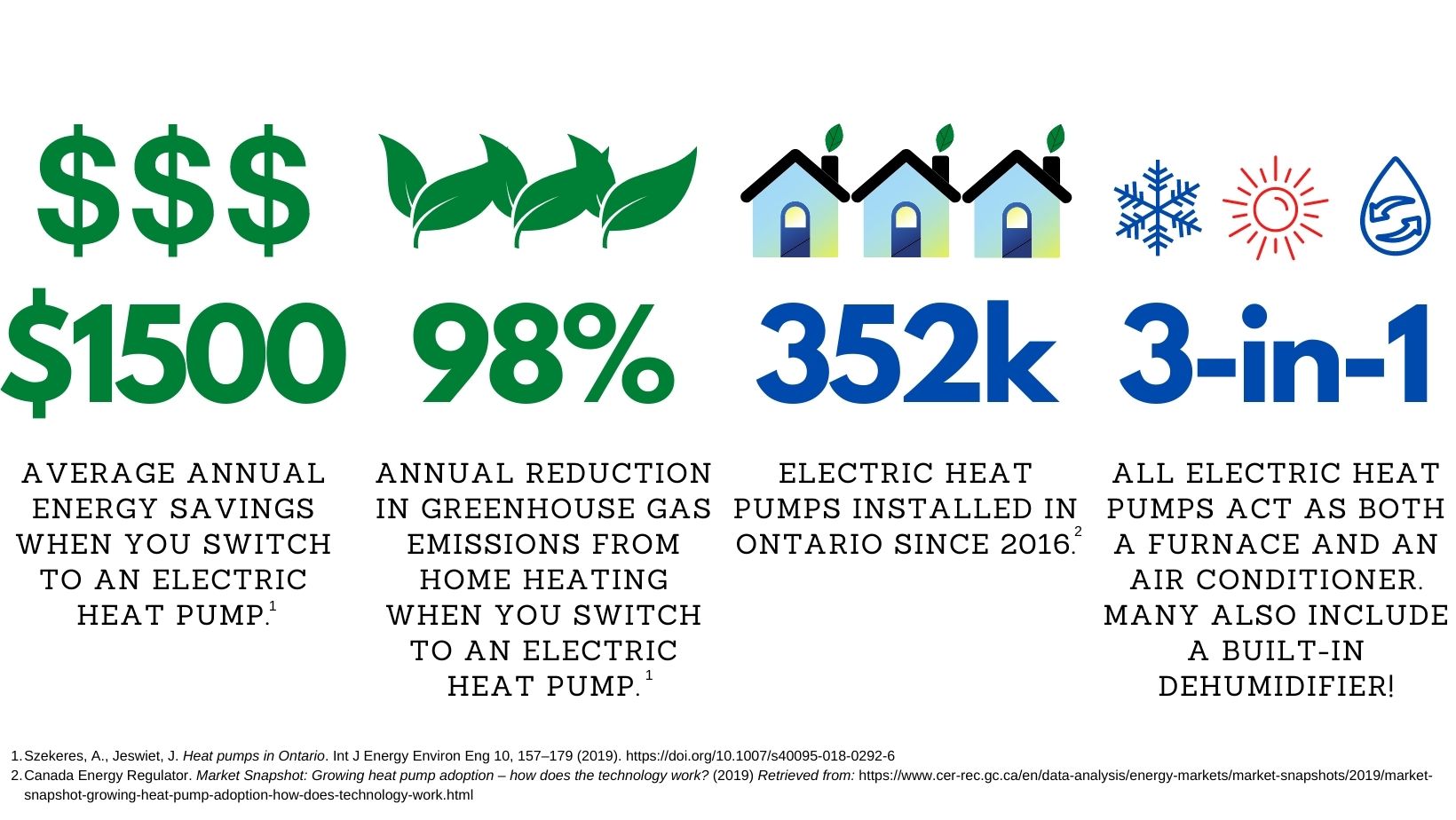 Because Ontario boasts a low-carbon electrical grid, electrification is the key to reducing our greenhouse gas emissions. Further, modern electric heat pumps are far more efficient than electric baseboard heaters and older heat pump technology. Installing a heat pump is one of the best ways to cut your household carbon emissions and energy costs.